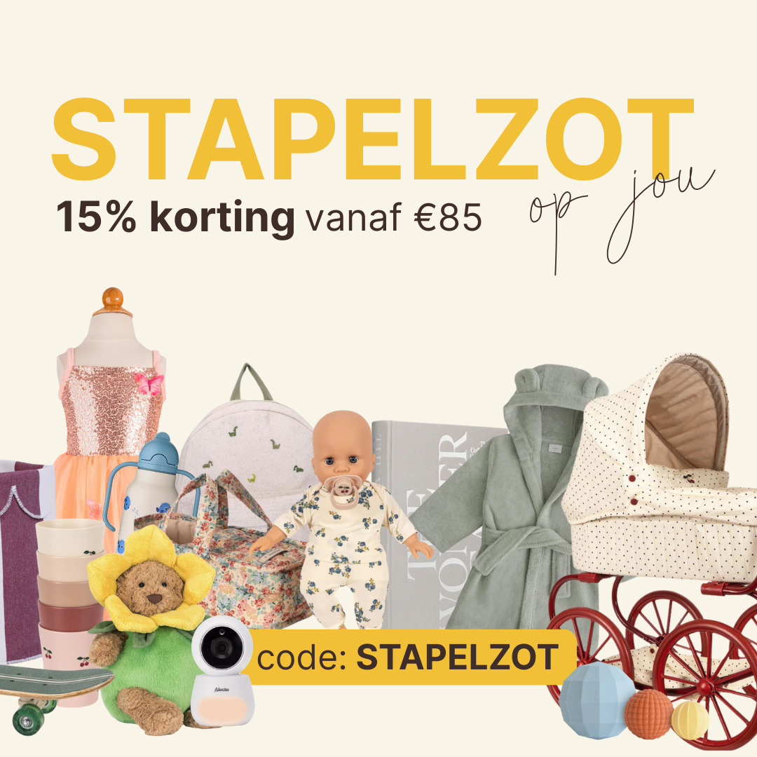 Met onze stapelzotte actie krijg je 15% korting vanaf €85. Dat betekent ruimte om nét dat extra item toe te voegen dat het leven met kinderen fijner maakt. Een knuffel voor onderweg of iets wat al lang op de wishlist stond.