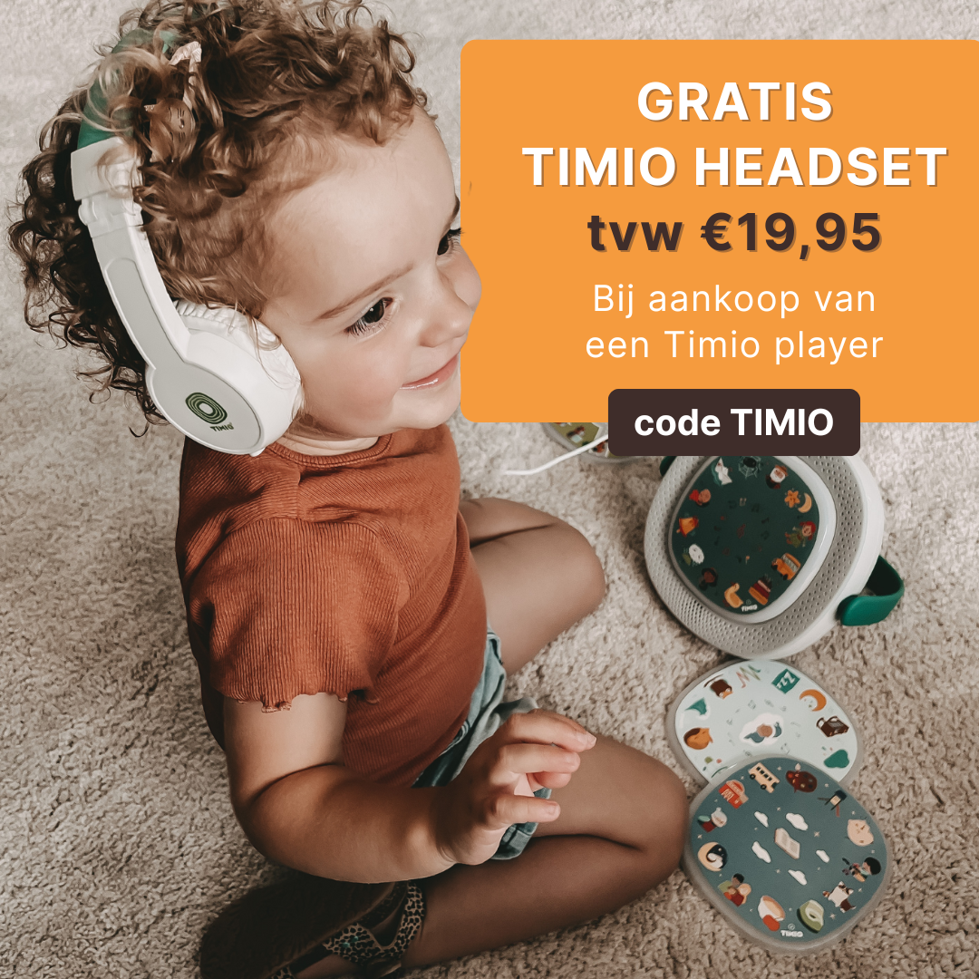 Bestel nu een Timio Player en ontvang er een gratis Timio headset bij t.w.v. €19,95! Zo kan je kindje helemaal opgaan in de interactieve leerwereld van Timio, zonder afleiding.