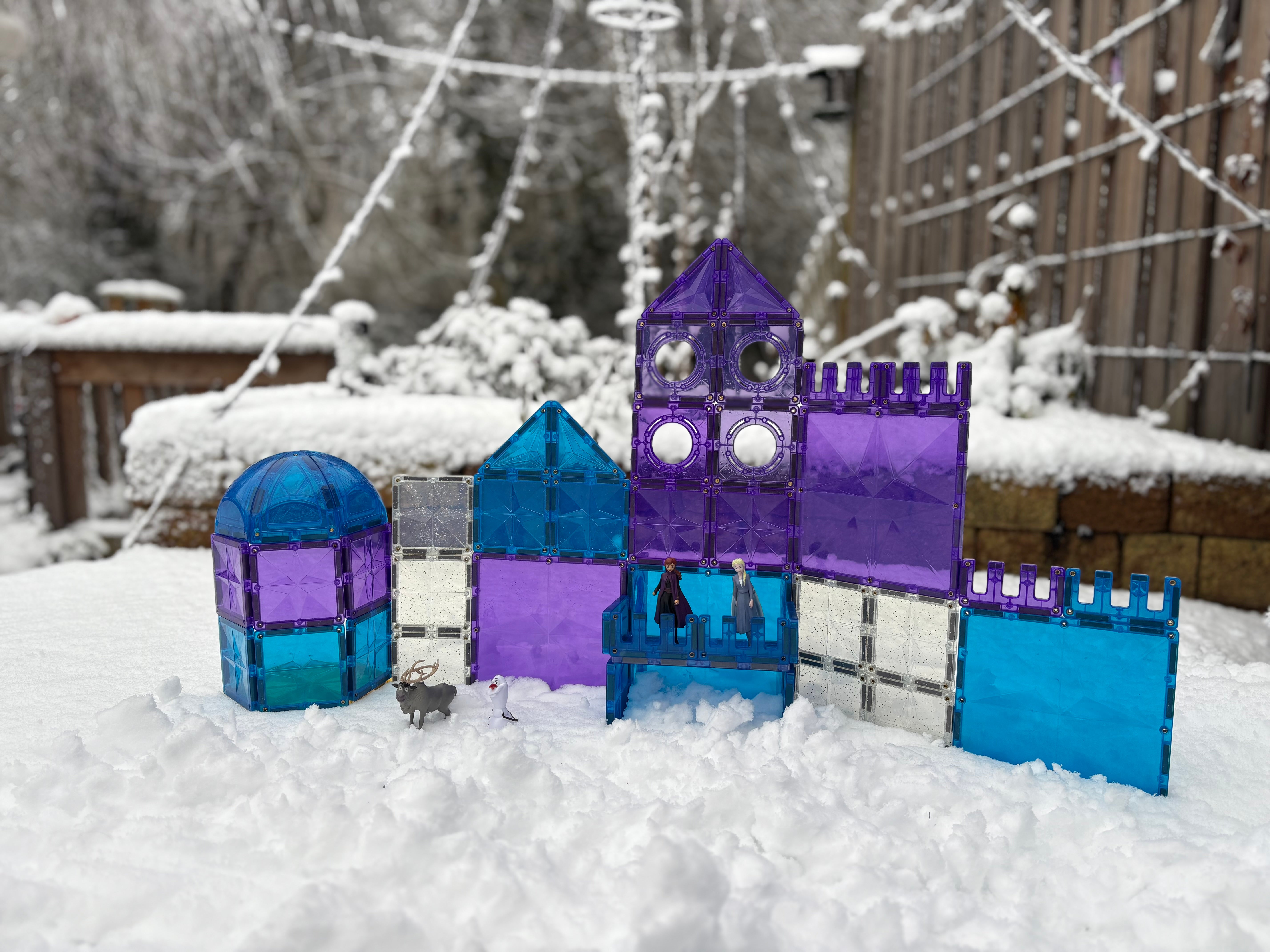 Zelfs in de sneeuw komt Cleverclixx tot zijn recht! Een ijspaleis gebouwd uit blauwige en paarse tegels , geplaatst in een winters landschap, creëert een sprookjesachtig tafereel. De combinatie van de koude witte sneeuw en de intense kleuren van de magnetische stenen maakt winterse speelsessies extra magisch.