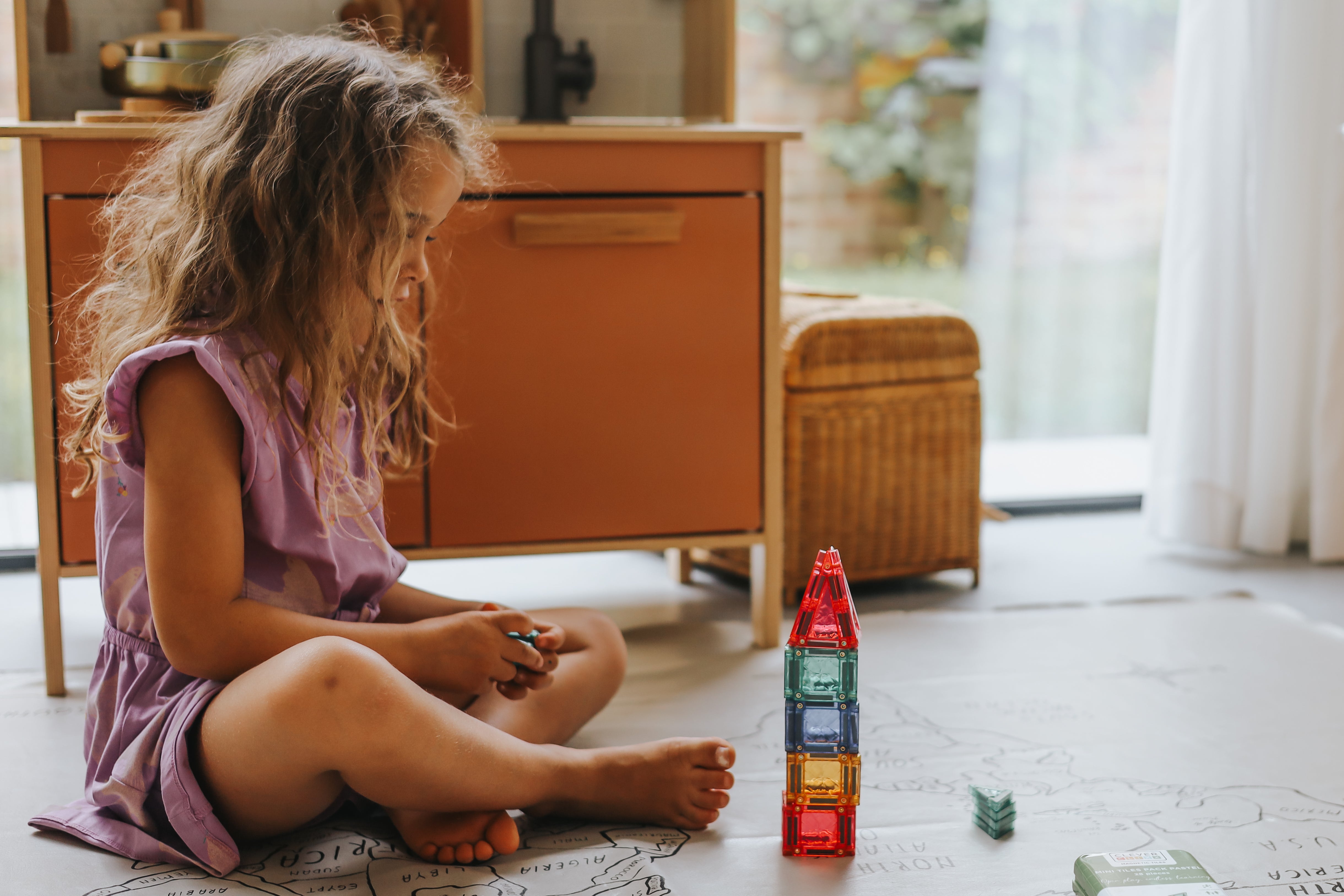 Kleurenleer: De doorzichtige tegels laten prachtig zien hoe kleuren mengen wanneer ze over elkaar heen gelegd worden. Een natuurlijke les in kleurtheorie.