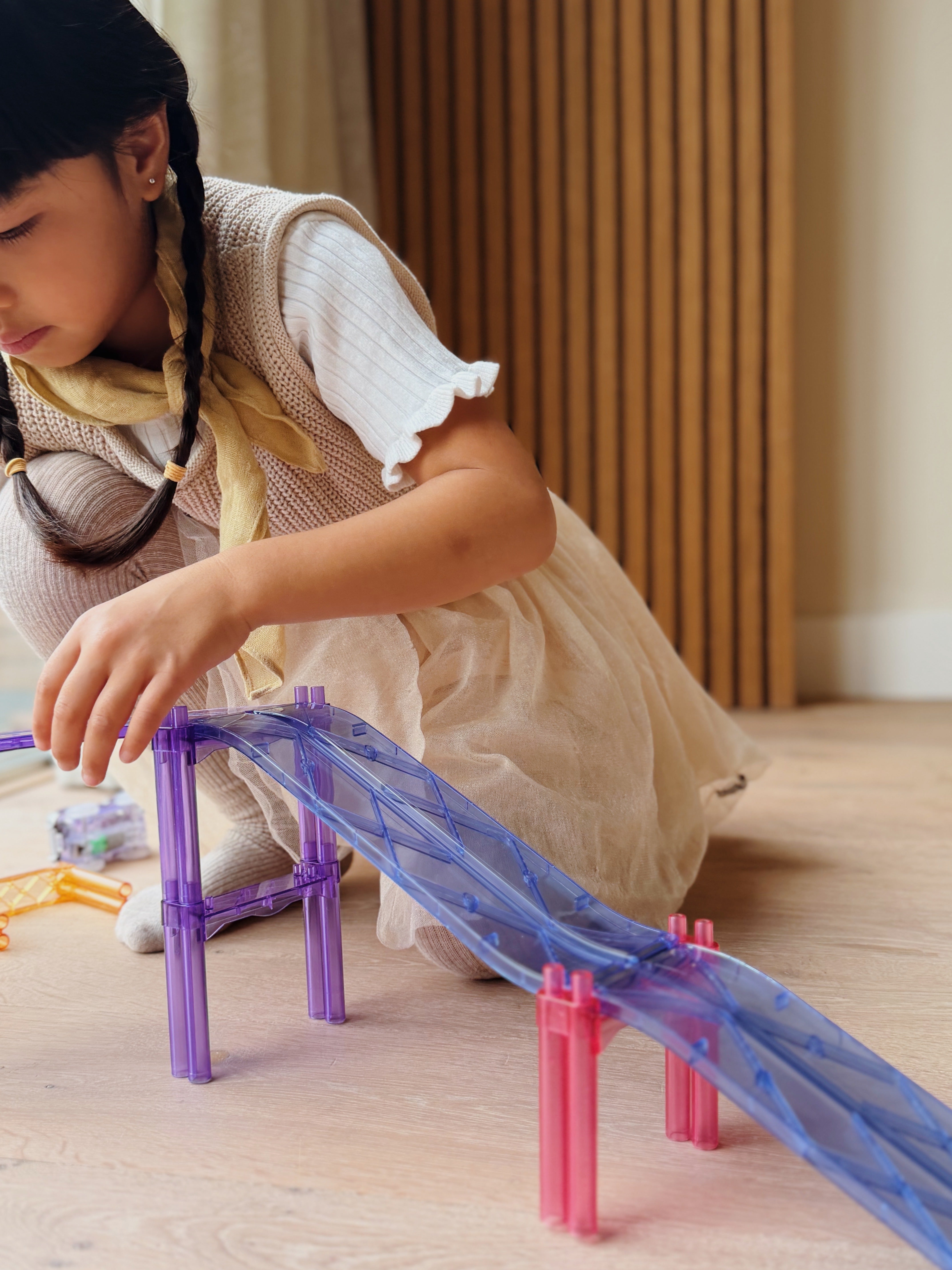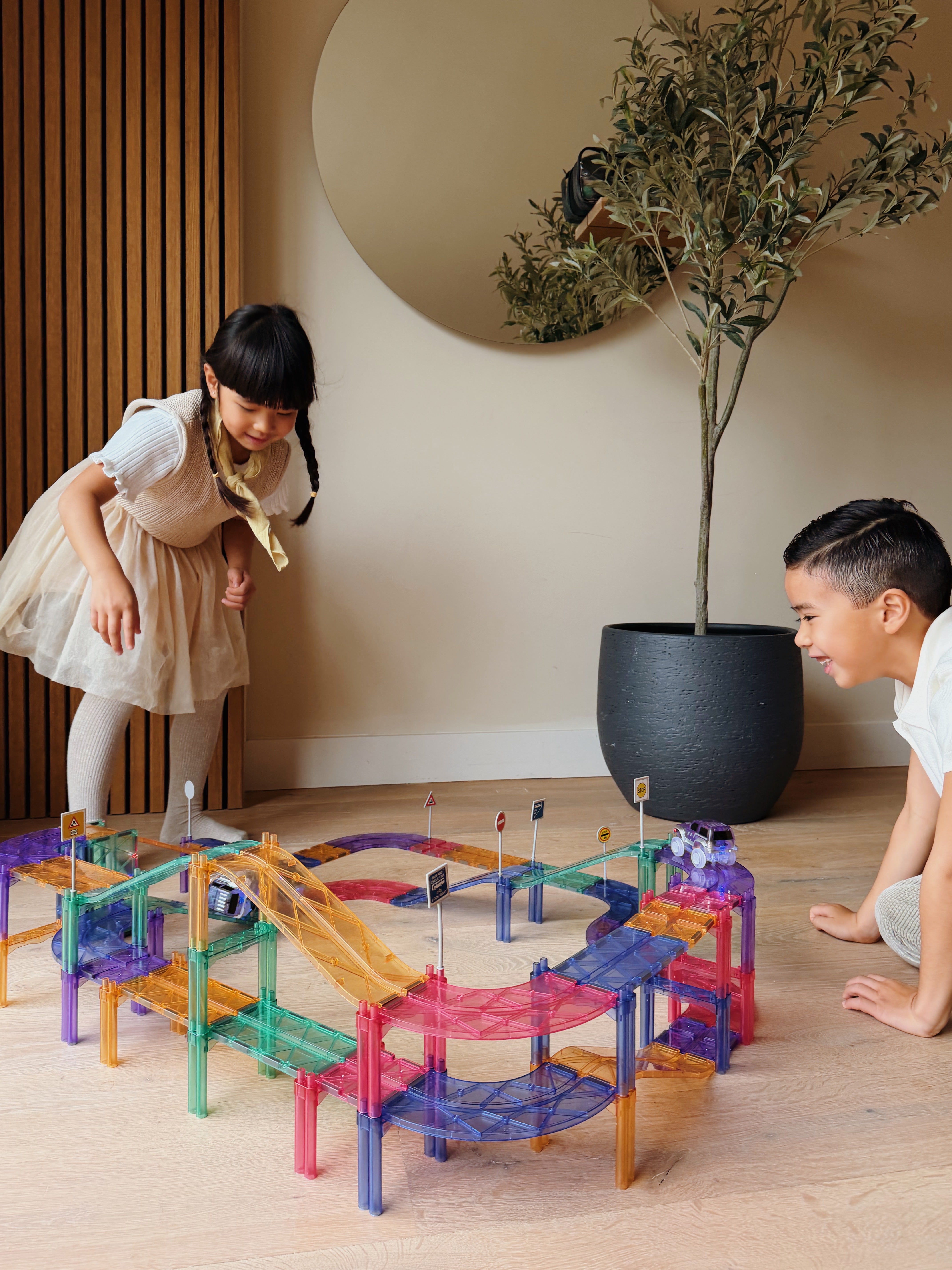 Voor de echte racefans heeft Cleverclixx iets heel bijzonders: speciale racebaan-sets in pastel of intense kleuren. Hiermee kunnen kinderen indrukwekkende circuits bouwen met bochten, bruggen en hellingen. Het spannendste? De sets komen met zelfrijdende autootjes die licht geven. Elke race is anders, afhankelijk van hoe je de baan bouwt.