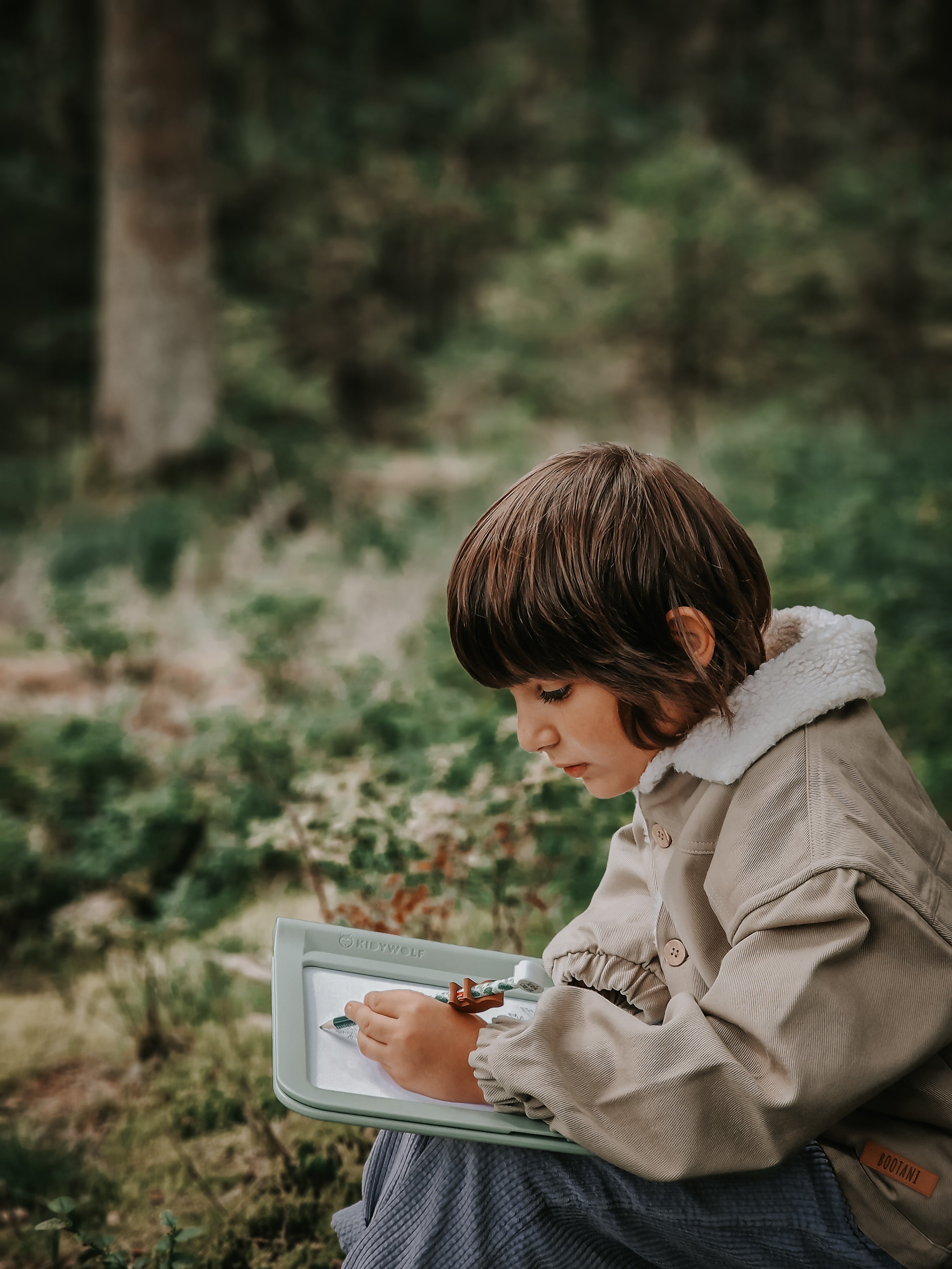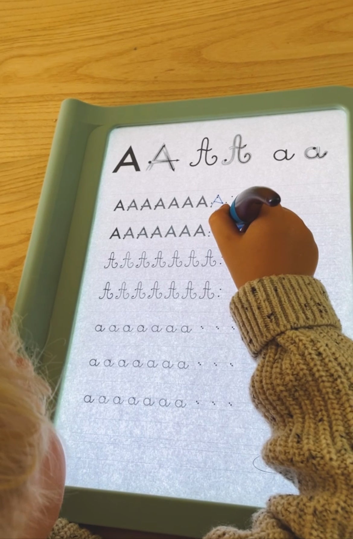 De voorkant van de KidyDraw Pro fungeert als een lichttablet: je kunt een blad met letters, cijfers of vormen onder het apparaat leggen en die traceren. Dat helpt kinderen om de juiste vormen, krommingen en verhoudingen te begrijpen. Door deze visuele ondersteuning wordt vooral de fijne motoriek gestimuleerd en ontstaat er meer vertrouwen in het schrijven. -