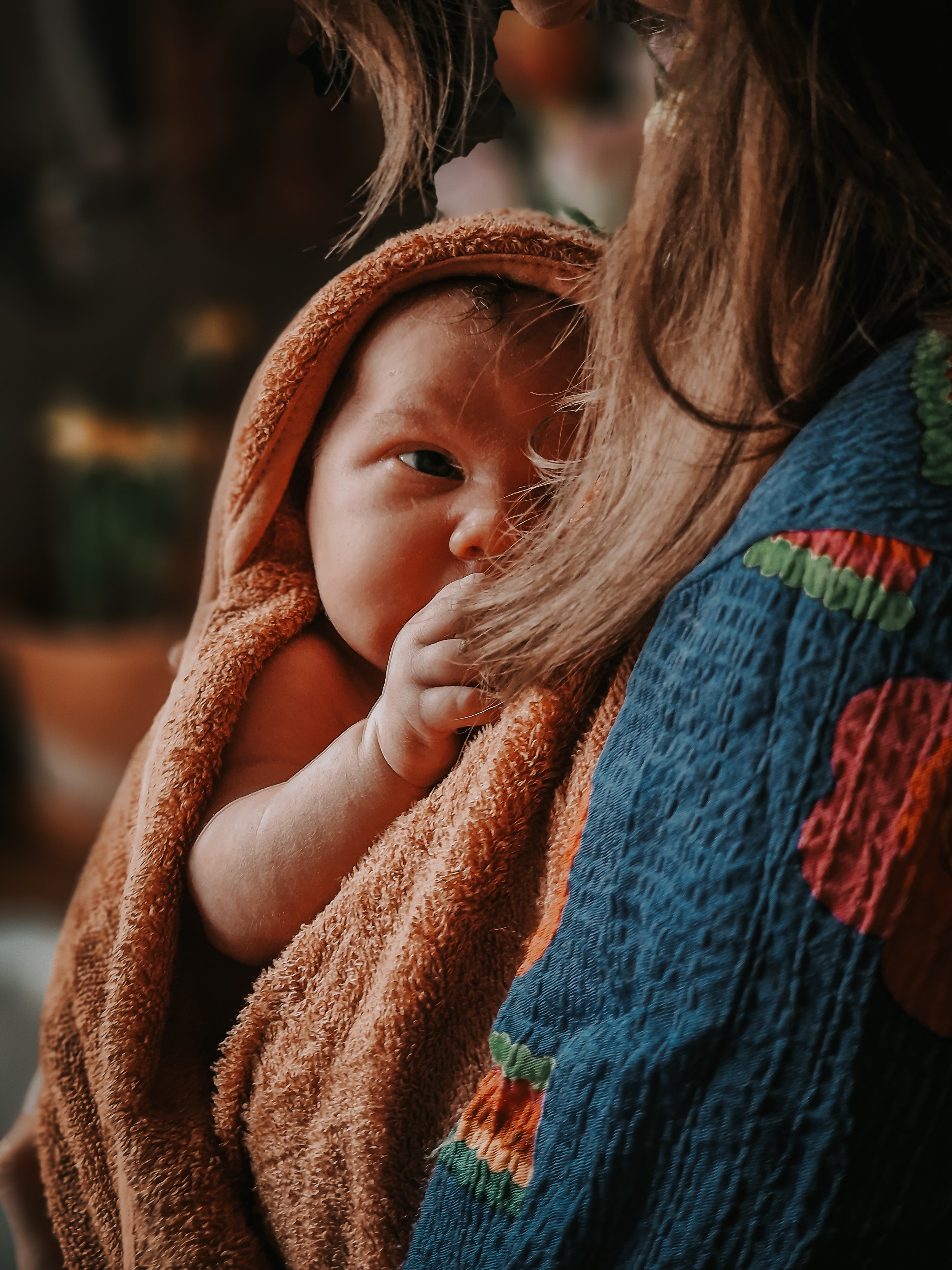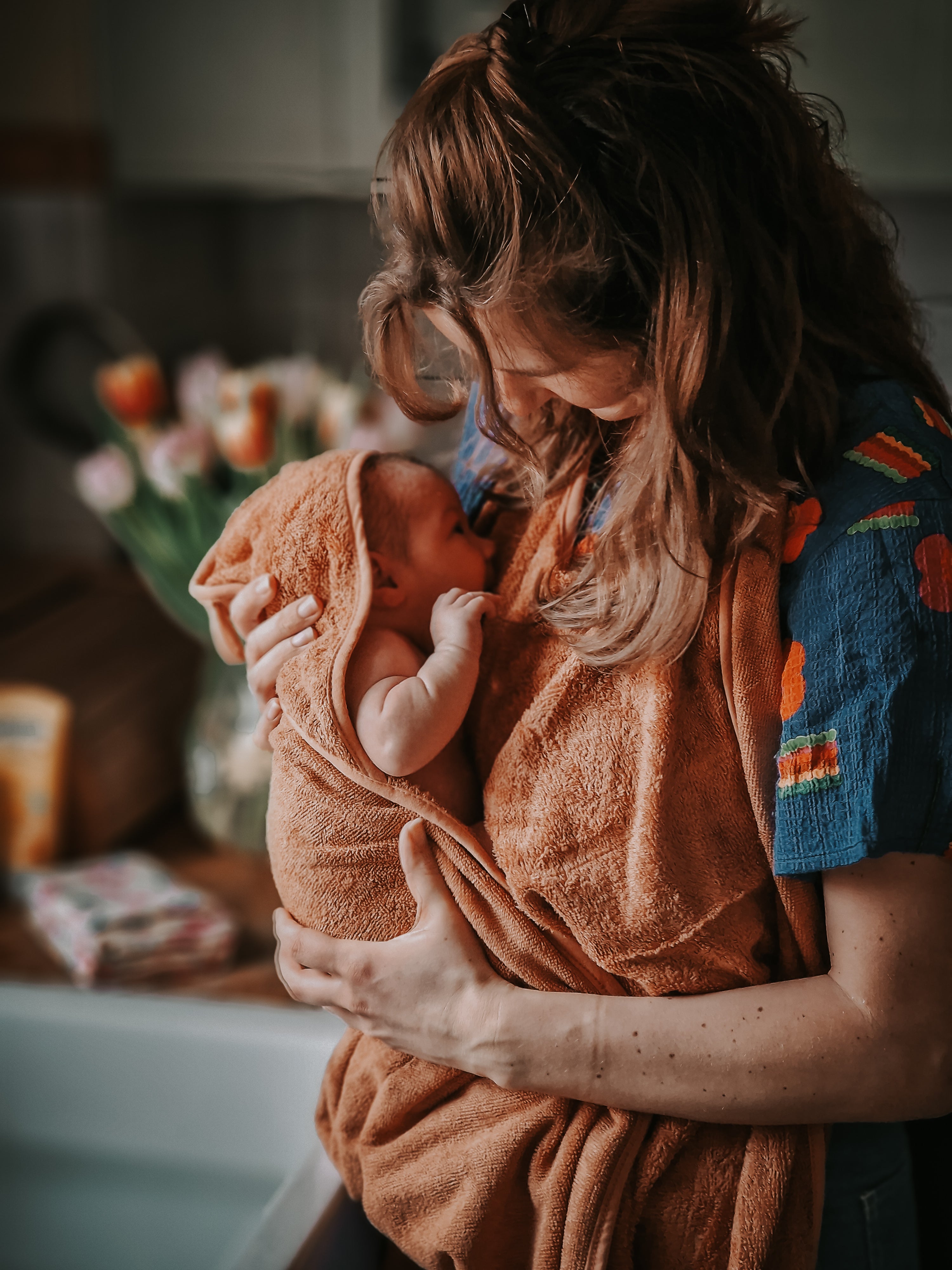 Een andere fijne ontdekking van Timboo is de ouder-baby badcape. Na het badmoment wikkel je je baby meteen dicht tegen je aan in de cape die je zelf draagt. Zo blijft je baby lekker warm terwijl jij zelf ook droog blijft. Je hoeft niet te zoeken naar een handdoek terwijl je je baby vasthoudt. Praktisch, maar tegelijk ook een heel warm moment samen.
