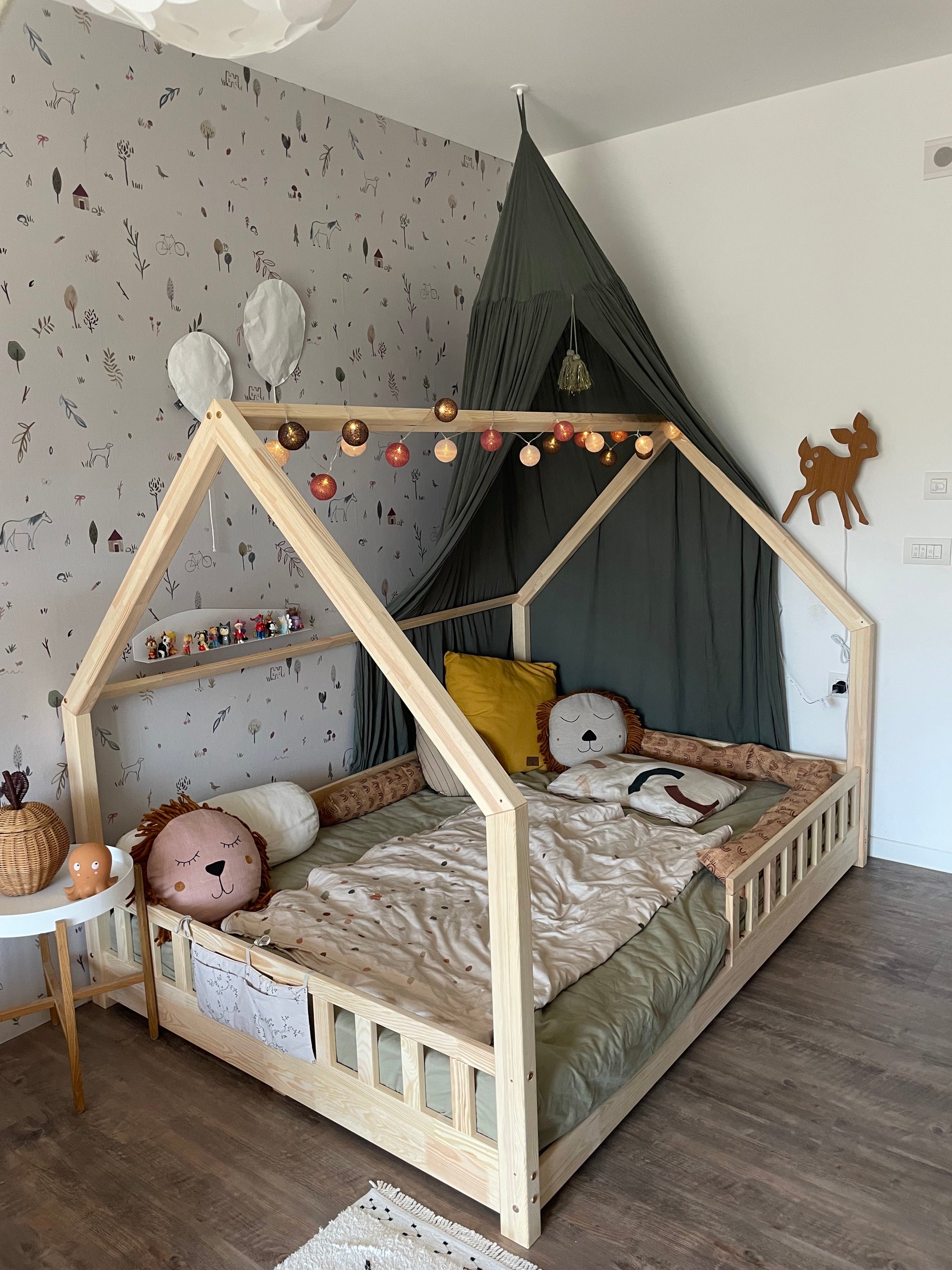 Onze bedhuisjes worden gemaakt van grenen hout. Ze zijn superstevig en zijn van topkwaliteit. Het bed staat stevig op de grond en beweegt niet wanneer je kiddo aan de balk hangt te slingeren. 😉