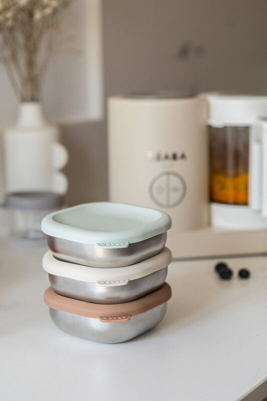 Deze set van drie roestvrijstalen bakjes met zachte siliconen deksels groeit met je baby mee, van de eerste hapjes tot peutersnacks. De bakjes van 250 ml zijn ideaal voor het bewaren, invriezen en opwarmen van zelfgemaakte groentepapjes en compotes. Dankzij hun komvorm kun je je baby rechtstreeks voeden, thuis of onderweg.