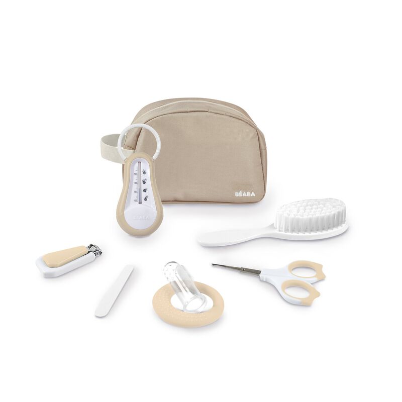 Deze compacte toilettas voor babyverzorging bevat 7 onmisbare accessoires: een badthermometer, schaar, nagelknipper, haarborstel, bijtring, tandvleesmassager en nagelvijl. Alles is zorgvuldig geselecteerd voor de dagelijkse hygiëne en verzorging van je baby.