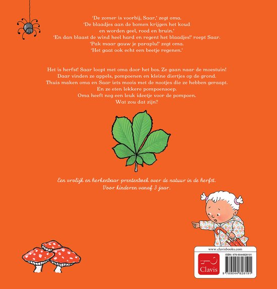 'De zomer is voorbij,' zegt oma. 'De blaadjes aan de bomen krijgen het koud en worden geel, rood en bruin.' 'En dan blaast de wind heel hard en regent het blaadjes!' roept Saar. 'Pak maar gauw je paraplu,' zegt oma. 'Het gaat ook echt een beetje regenen.' Het is herfst! Saar loopt met oma door het bos. Daar vinden ze appels, pompoenen en kleine diertjes op de grond. Thuis maken oma en Saar iets moois met de nootjes die ze hebben geraapt. En ze eten lekkere pompoensoep. Oma heeft nog een leuk ideetje voor de pompoen. Wat zou dat zijn? Een vrolijk en herkenbaar prentenboek over de natuur in de herfst. Voor kinderen vanaf 3 jaar.