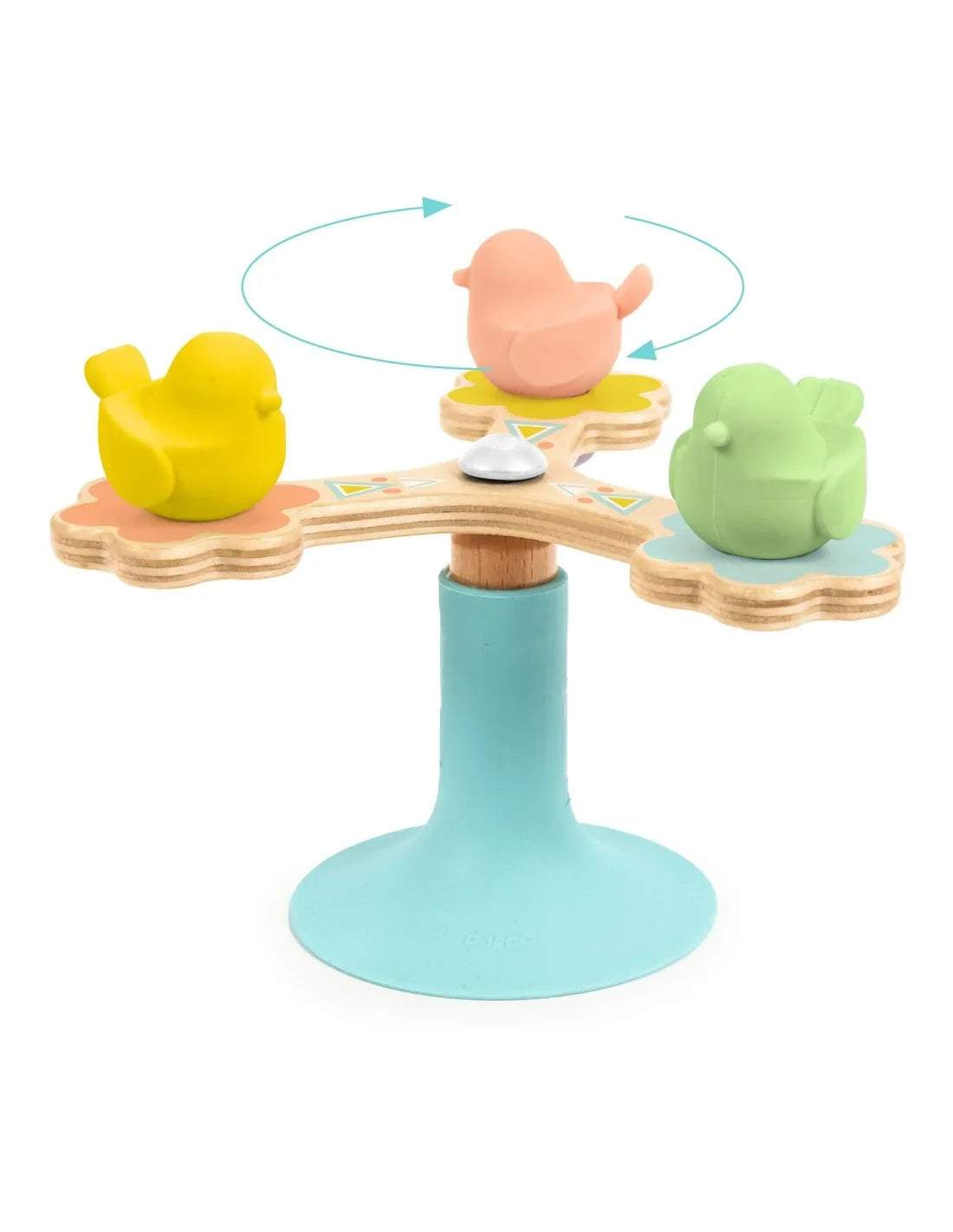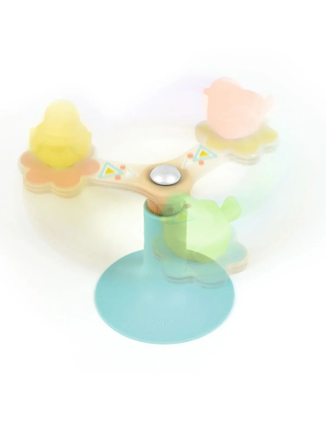 De nieuwe BabySpini van Djeco is een betoverend babyspeelgoedje dat jonge kinderen vanaf 12 maanden uitnodigt om te ontdekken en te spelen. Met een lichte handbeweging geeft het kind een impuls aan de drie vogeltjes, die vervolgens snel en langdurig rond hun as draaien. Het fascinerende draai-effect en de zachte pastelkleuren zorgen voor eindeloos kijkplezier en stimuleren de nieuwsgierigheid. Dankzij de stevige zuignap blijft het speelgoed stabiel op tafel of kinderstoel.