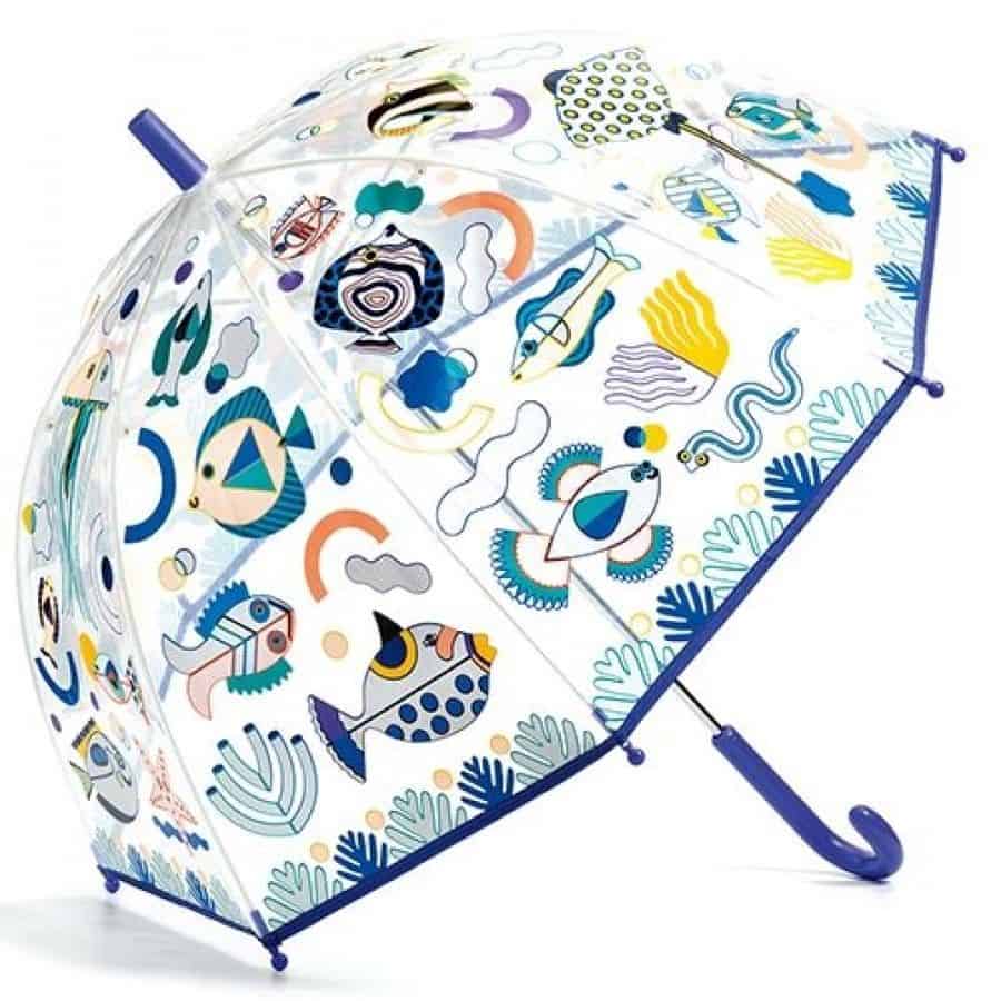 De Djeco kinderparaplu is een vrolijke, doorzichtige paraplu met kleurrijke illustratie. Door het transparante scherm kan je kind goed zien waar het loopt—superhandig én leuk tijdens regenachtige dagen.