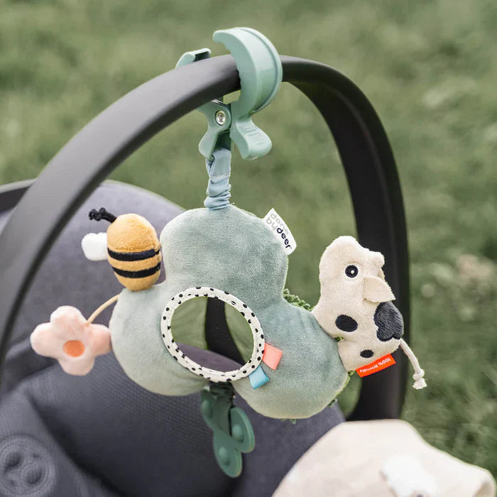 Het speeltje is compact, licht en dankzij de handige bevestiging makkelijk mee te nemen. Je hangt het zo aan de wandelwagen, autostoel of een activiteitencentrum, zodat je baby overal een boeiend speelmaatje heeft. Met een formaat van 21 × 20 × 5 cm is het perfect voor kleine handjes vanaf 0 maanden.