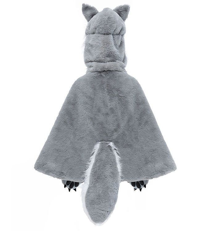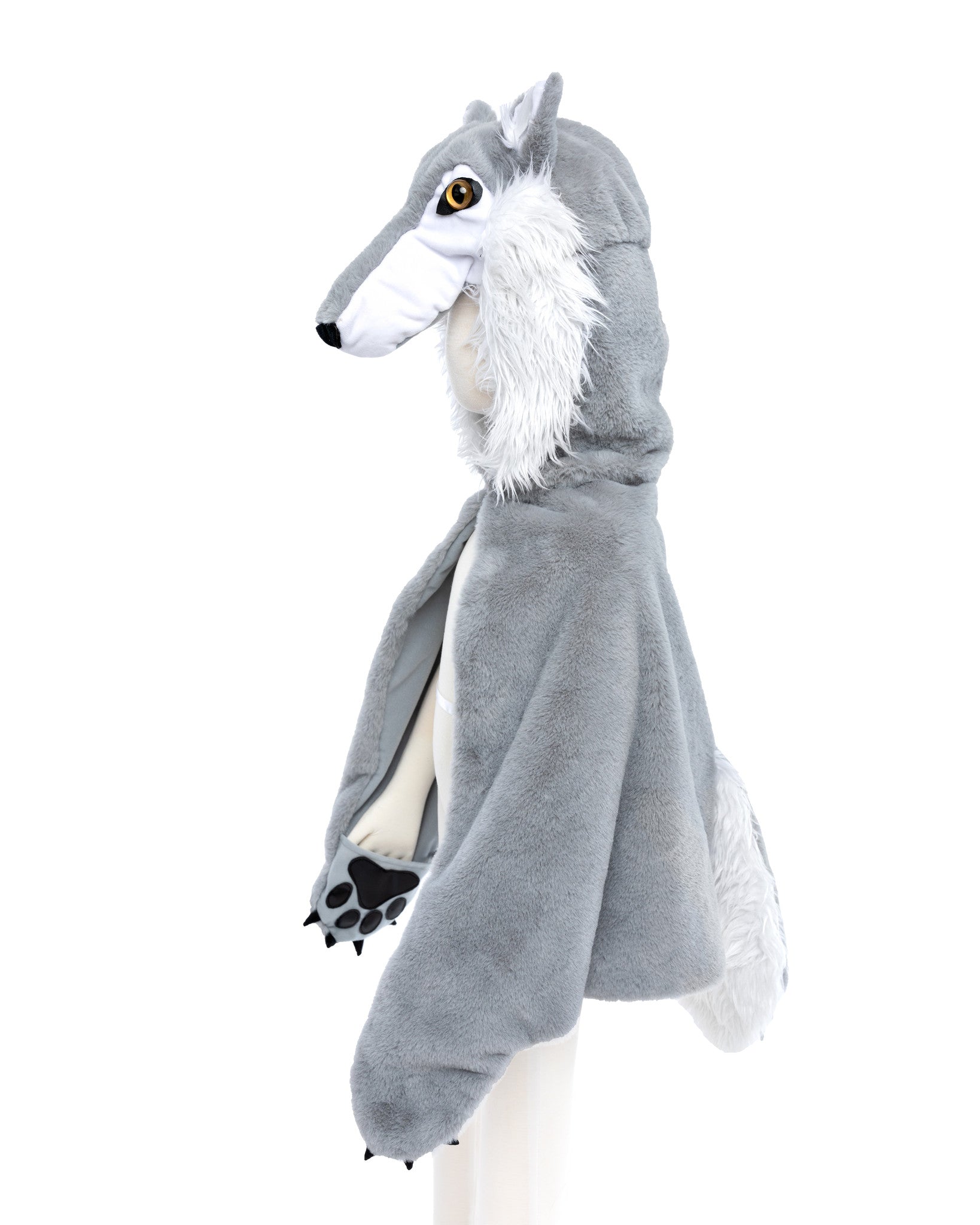 Een prachtige wolf verkleedcape. Deze cape heeft een realistisch wolvengezicht uit één stuk, witte vacht rond de nek, een witte staart en bevestigde poten. Gemaakt met een elastische lus aan de binnenkant van de poten, zodat uw kind de poten gemakkelijk kan vastpakken, zelfs als de armen niet lang genoeg zijn.