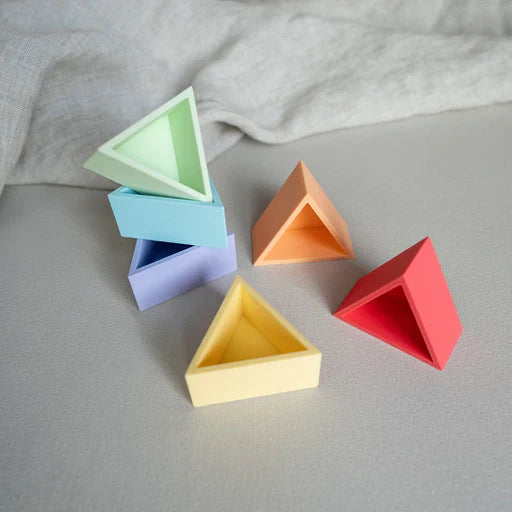 De mandigo driehoek bakjes zijn ontworpen om materialen overzichtelijk te sorteren tijdens sensorisch spel. Elk bakje heeft dezelfde vorm en kan eenvoudig gecombineerd worden met andere kleuren. Ze zijn verkrijgbaar in zowel regenboog- als pasteltinten, zodat je precies het kleurenpalet kunt kiezen dat past bij jouw speelhoek of thema.