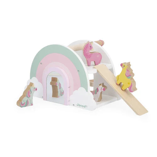 Het leukste houten speelgoed in huis van Janod. Welkom in het eenhoornhuis! Laat je kindje de leukste verhalen verzinnen en vertellen met dit houten huis in de vorm van een regenboog.