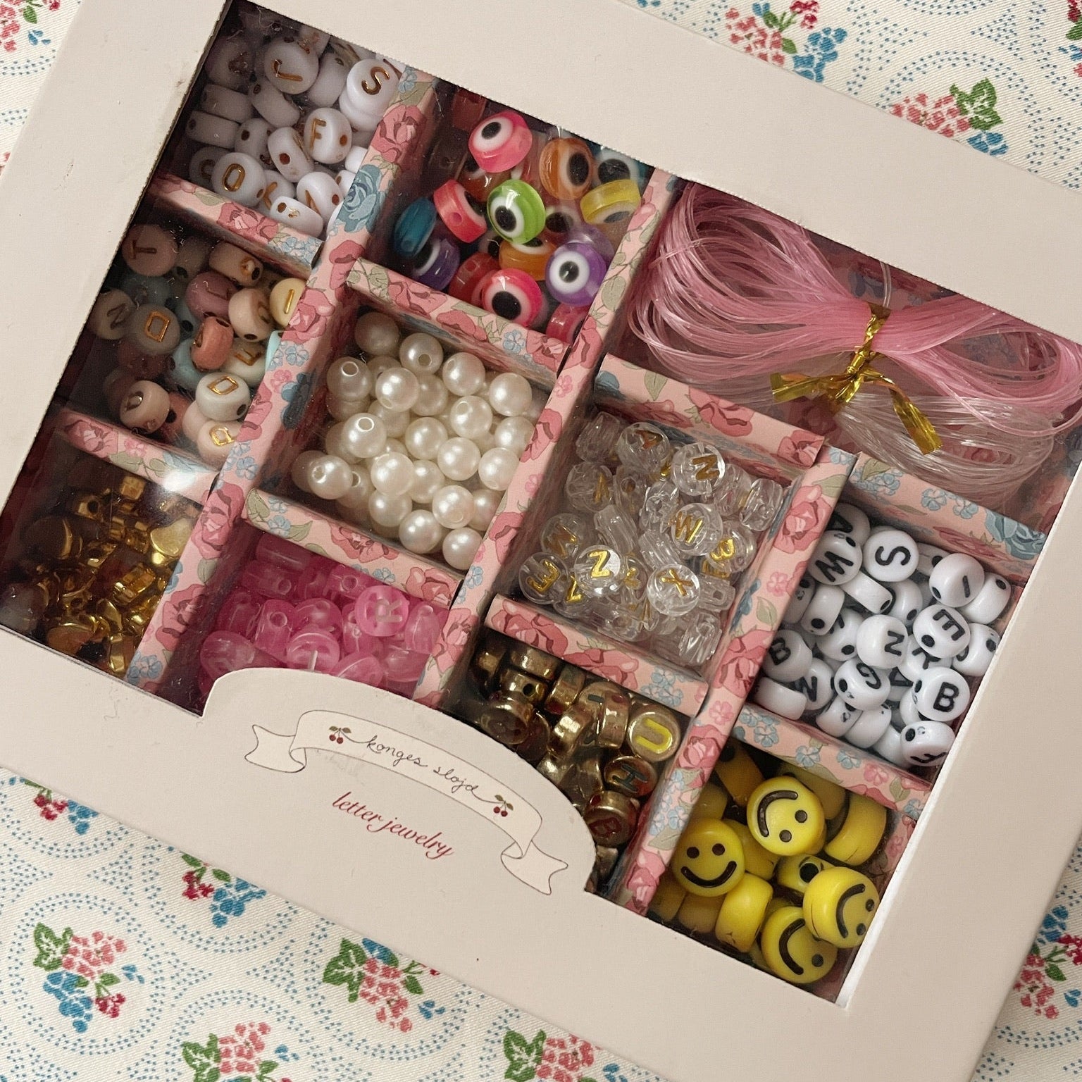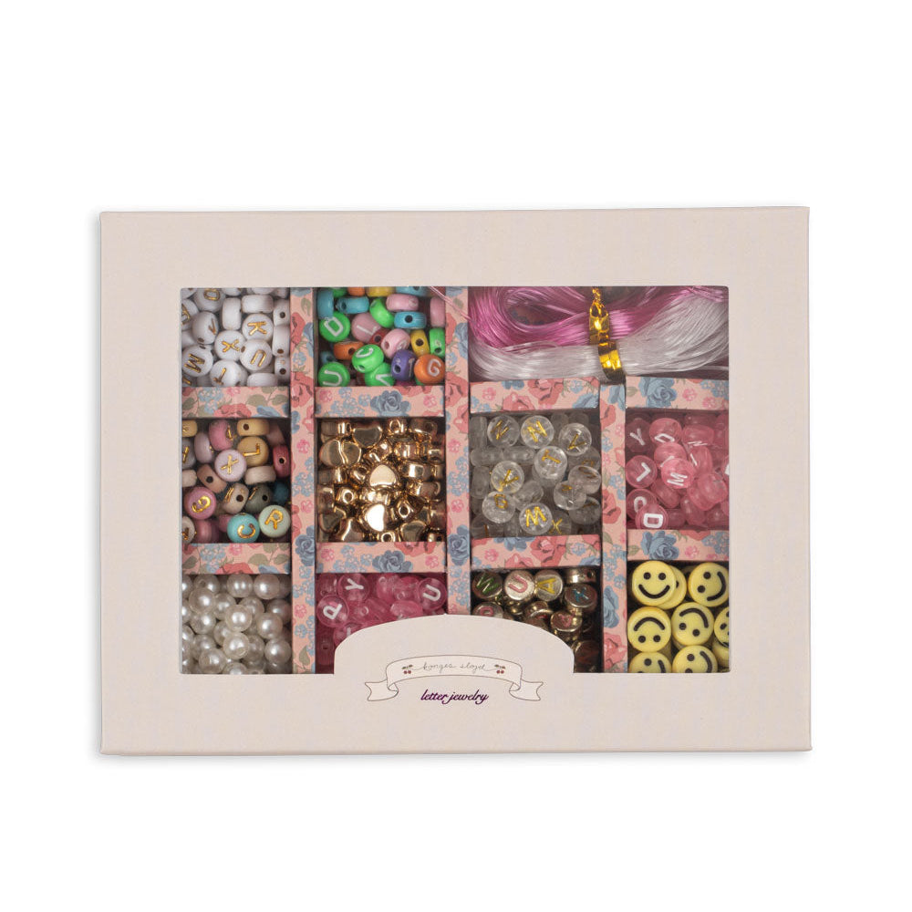 Laat de creativiteit sprankelen met deze betoverende juwelenset van Konges Slojd! De set bevat kleurrijke parels met letters van het alfabet, perfect om de leukste armbandjes mee te maken. Kinderen kunnen hun eigen naam rijgen, geheime boodschappen maken of gewoon mixen en matchen met hun favoriete kleuren.