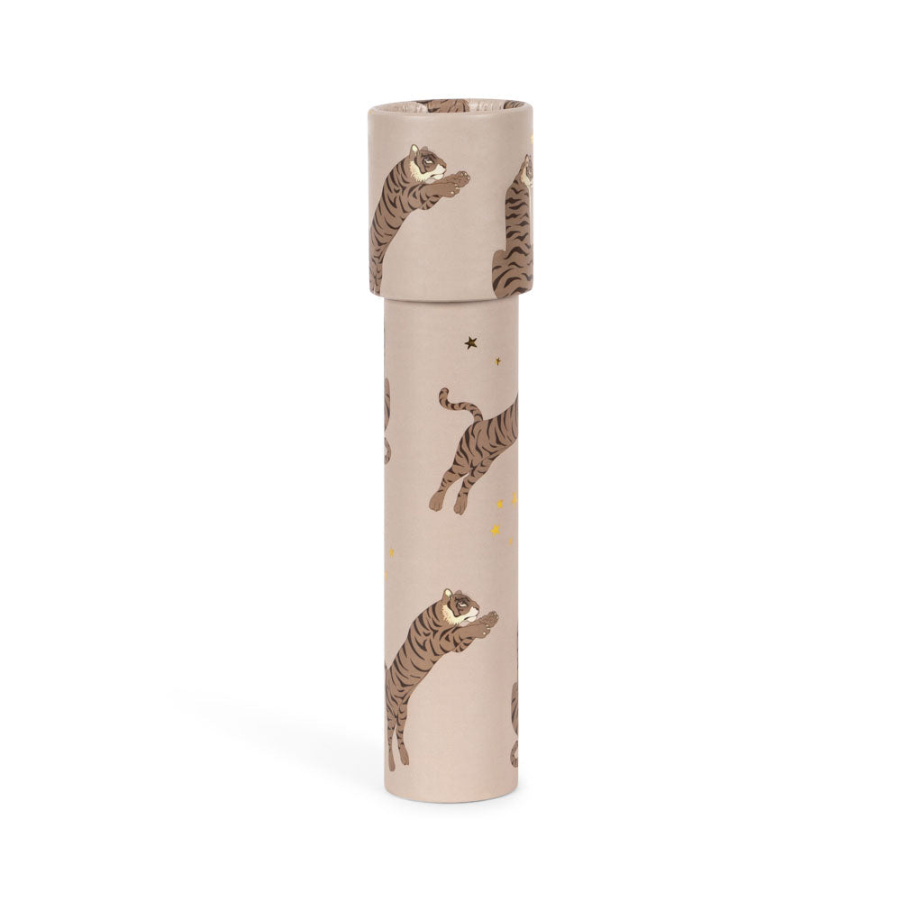 Een kaleidoscoop met parels langs de binnenkant. Kijk door de kaleidoscoop en geniet van de verschillende kleuren en patronen.