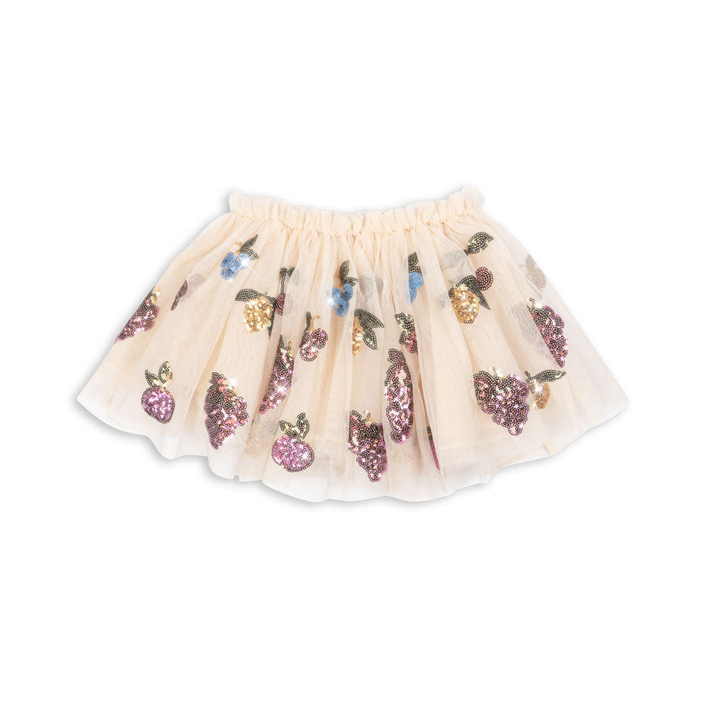 Volumineuze tule rok met een zachte katoenen voering en elastische taille. Versierd met pailletten.