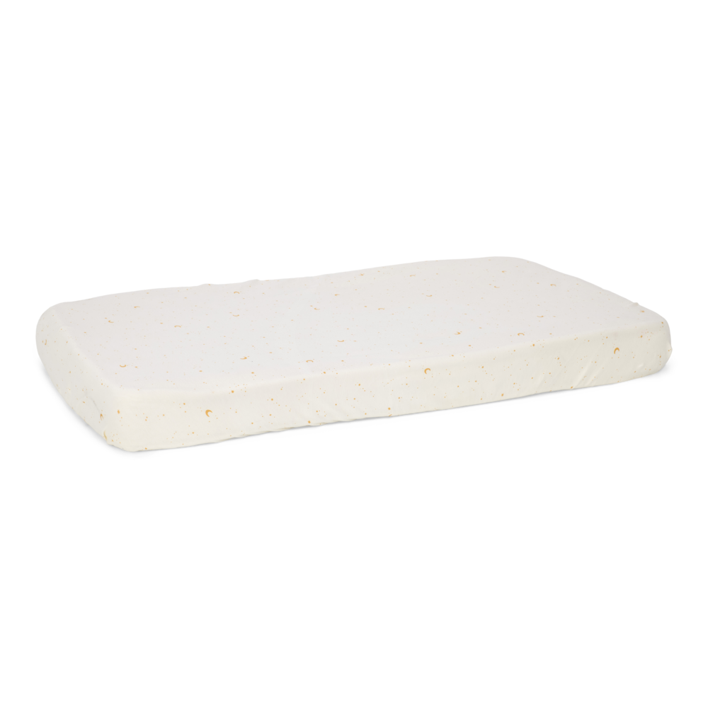 Bedek het matras van je kleintje met dit hoeslaken voor een goede nachtrust, zodat ook de kleinste sterren lekker kunnen slapen. Het zachte biologische katoen, behandeld met een perzikwassing, zorgt voor rustgevend comfort waar zelfs de wildste dromen van tot rust komen. Het elastische katoen sluit perfect om het matras en blijft mooi, zelfs na meerdere wasbeurten. De crèmekleur met de schattige Moon & Stars print brengt een dromerige sfeer in de kamer van je kindje en past prachtig bij het beddengoed van Little Dutch.