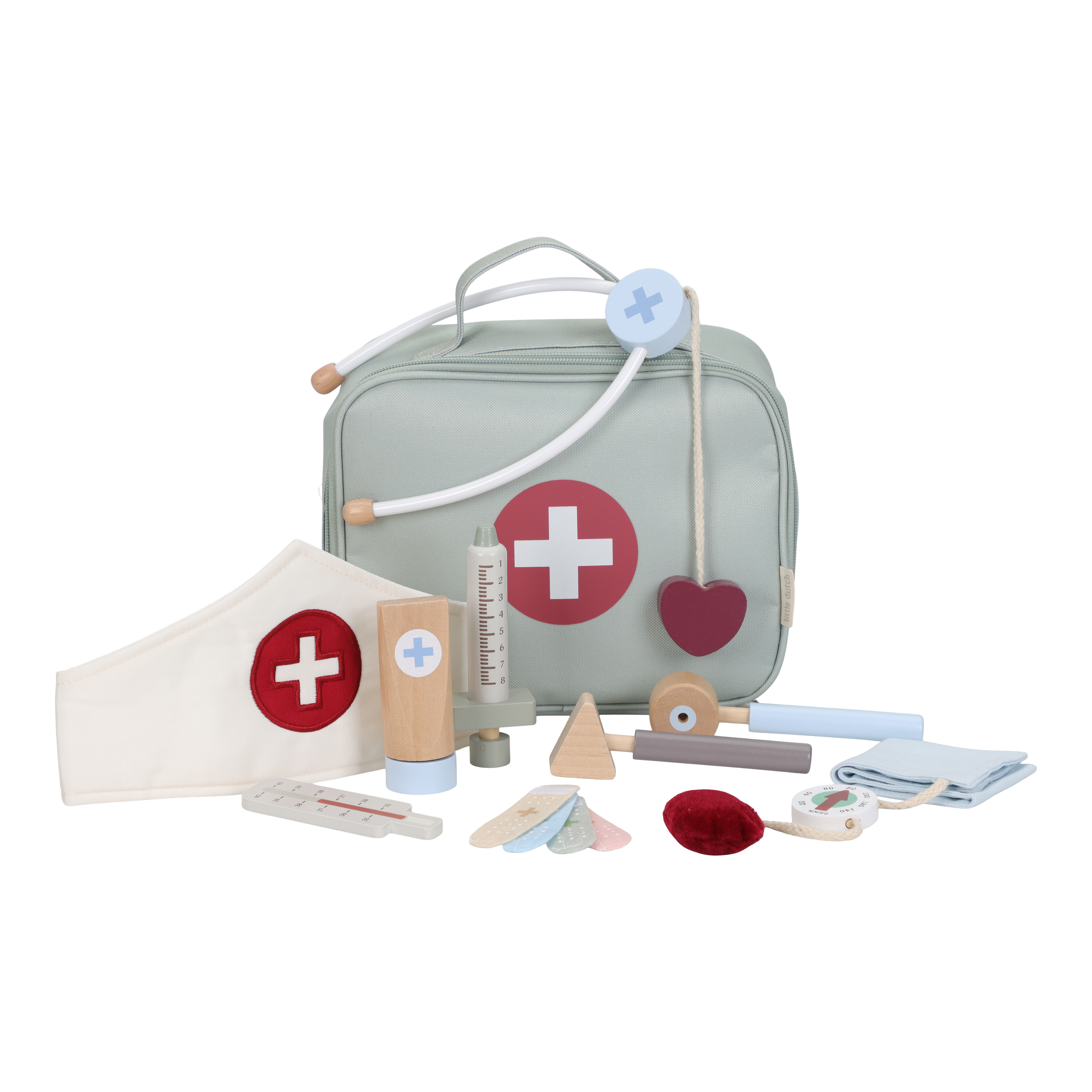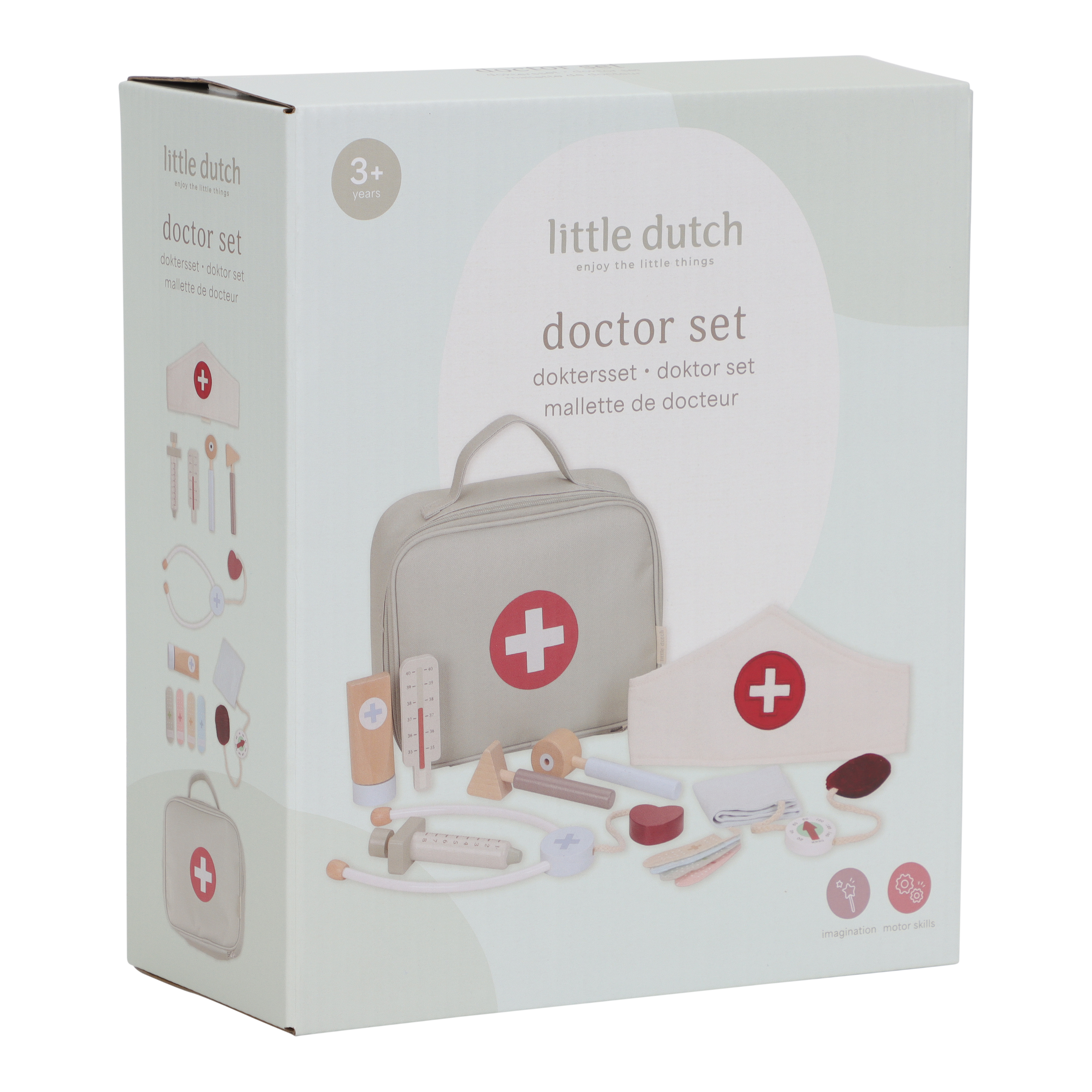 Met deze complete houten doktersset van Little Dutch is jouw kleintje helemaal klaar om voor patiënten te zorgen. De stoffen dokters tas bevat alle essentiële medische hulpmiddelen, zoals een thermometer, injectiespuit, verband, stethoscoop en bloeddrukmeter. Zelfs een doktersmuts is inbegrepen! Perfect voor fantasierijk rollenspel en om vertrouwd te raken met doktersbezoeken. Wie is de volgende patiënt?