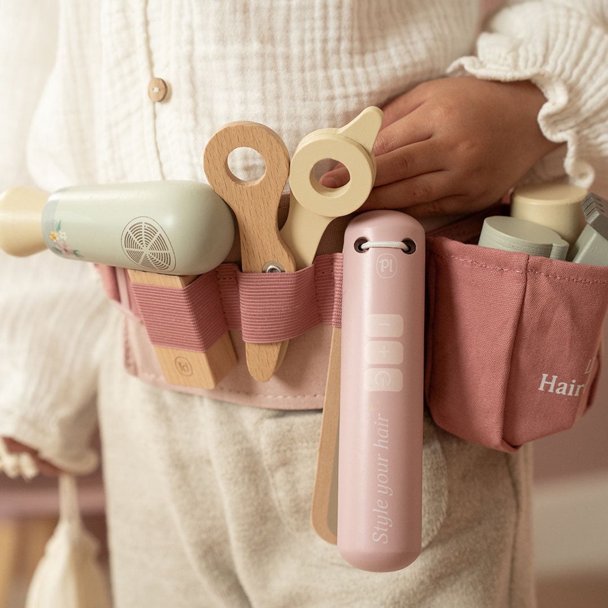 Knippen, föhnen en stylen zoals in een echte salon? Met de Little Dutch Houten Kappersset kan jouw kindje zich helemaal uitleven als mini-kapper of -kapster! Deze stijlvolle en complete speelset bevat alles wat nodig is om familie, vriendjes of knuffels een volledig make-over te geven. Van een houten schaar tot een föhn en zelfs een stijltang – alles zit netjes opgeborgen in een verstelbare roze heupriem, zodat de jonge stylist altijd klaarstaat voor het volgende kapsel.