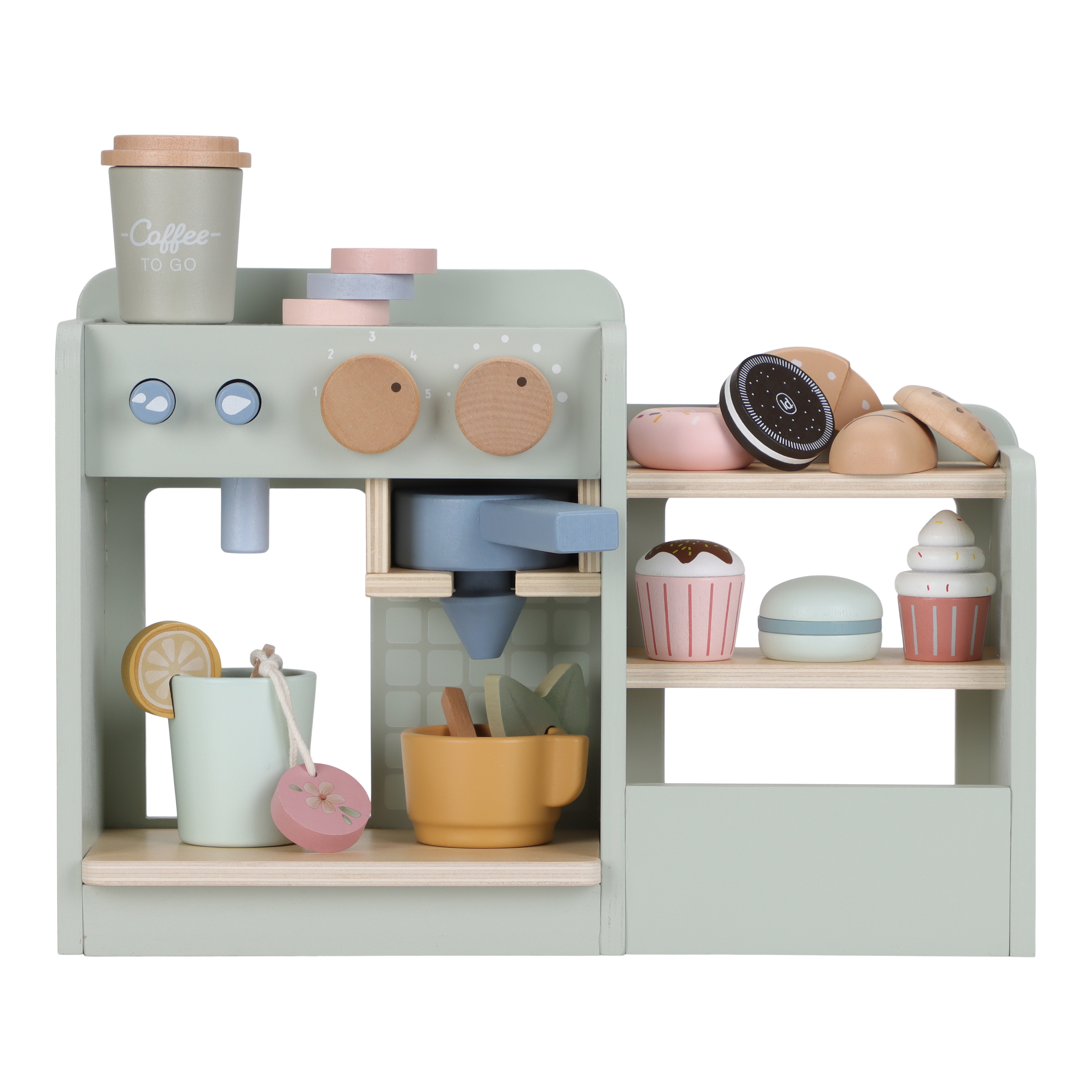 Deze té leuke set bevat een koffie en thee-machine, opbergplek voor kopjes en een toonbankje voor de gebakjes.
