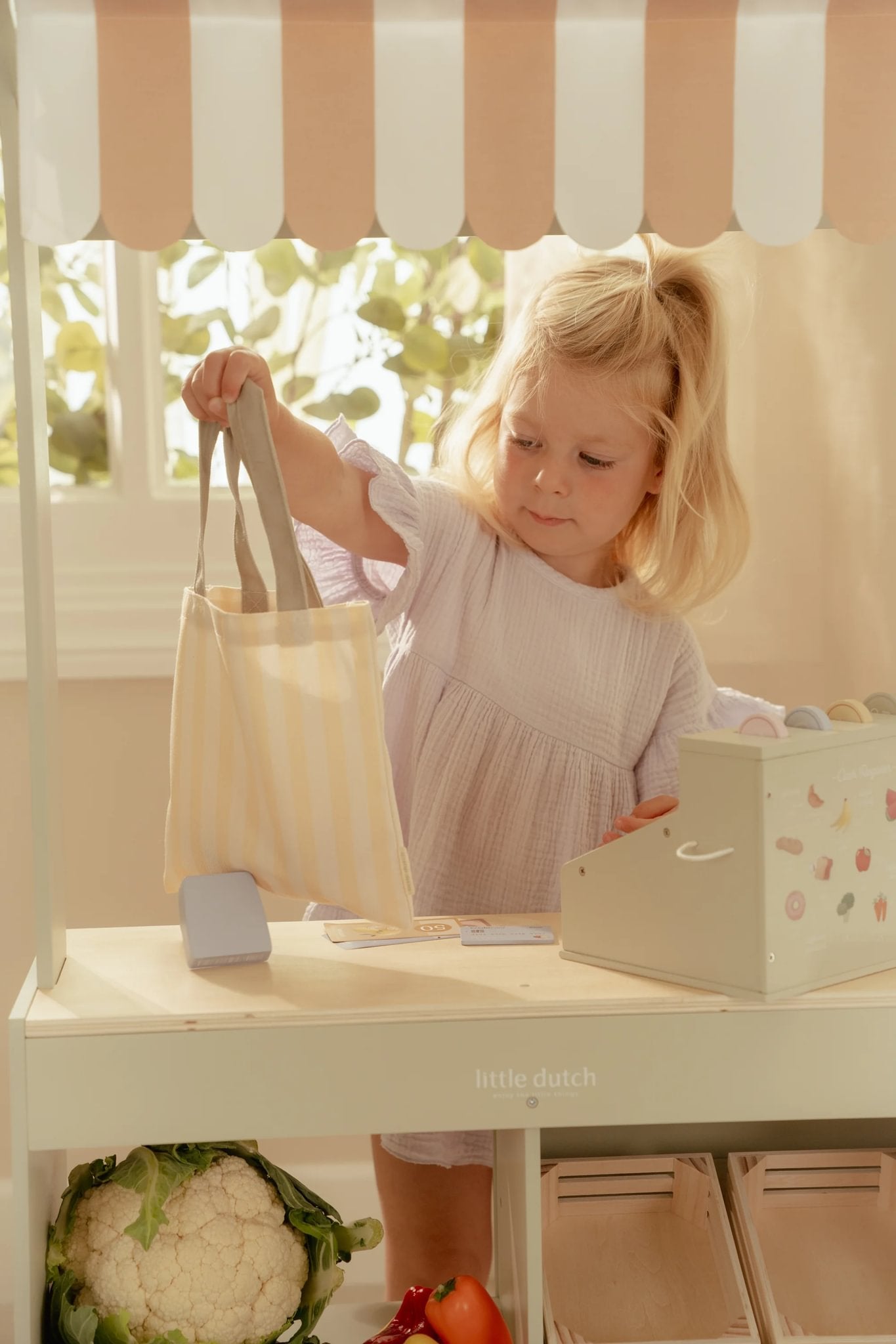 Welkom op de markt! Met deze prachtige houten marktkraam kunnen kinderen hun eigen winkeltje spelen en hun fantasie de vrije loop laten. De stoffen luifel zorgt voor een authentieke marktsfeer, terwijl het krijtbordje en de geïllustreerde kaartjes helpen om de producten mooi uit te stallen.