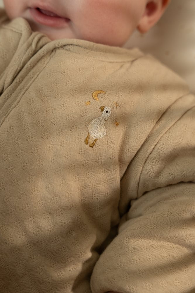 Houd je kleintje warm en knus deze winter met de Little Dutch winterslaapzak in de elegante Soft Beige kleur. Gemaakt van luxe jersey jacquard stof en 100% biologisch katoen, voelt hij heerlijk zacht aan. Het schattige borduursel met gansje op de borst zorgt voor een vleugje charme, terwijl de ronde onderkant en afritsbare mouwen praktisch en comfortabel zijn. Perfect voor koude nachten en schattige dromers. Er zit een flap over de rits om de gevoelige babyhuid te beschermen. De slaapzak is verkrijgbaar in 70 cm en 90 cm.