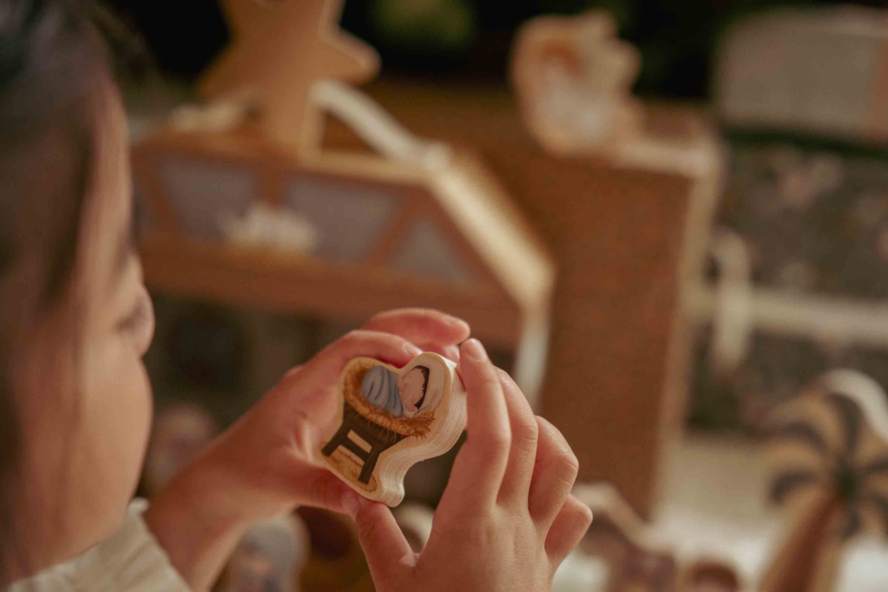 De koffer bevat prachtig geïllustreerde houten figuren, waaronder Maria, Jozef, baby Jezus, de drie koningen, herders, dieren en een engel. Elk figuur is met zorg ontworpen in zachte kleuren, typisch voor de herkenbare Little Dutch-stijl. Kinderen kunnen het verhaal naspelen, hun eigen interpretatie geven of de kerststal neerzetten als decoratief element in de kinderkamer of woonkamer.