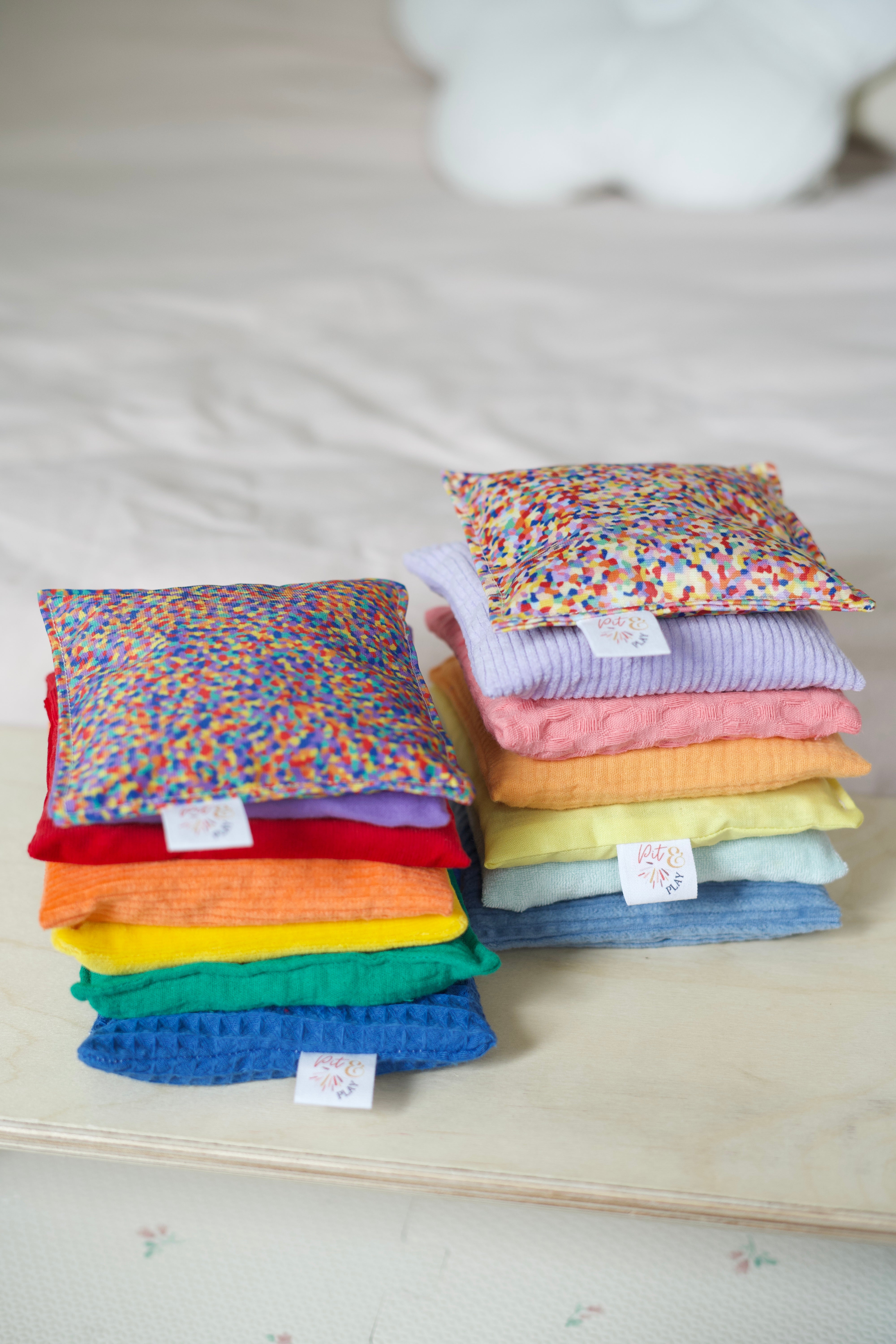 De zakjes groeien mee met de speelbeleving en fantasie van je kind. Geschikt voor kinderen van 0 tot 8 jaar oud. Dit speelgoed prikkelt de zintuigen van je kindje en is goed voor de motorische- en sociale ontwikkeling. Gooien, voelen, balanceren, over heen lopen, poppenbedjes maken, kleur herkenning. Heel veelzijdig speelgoed.