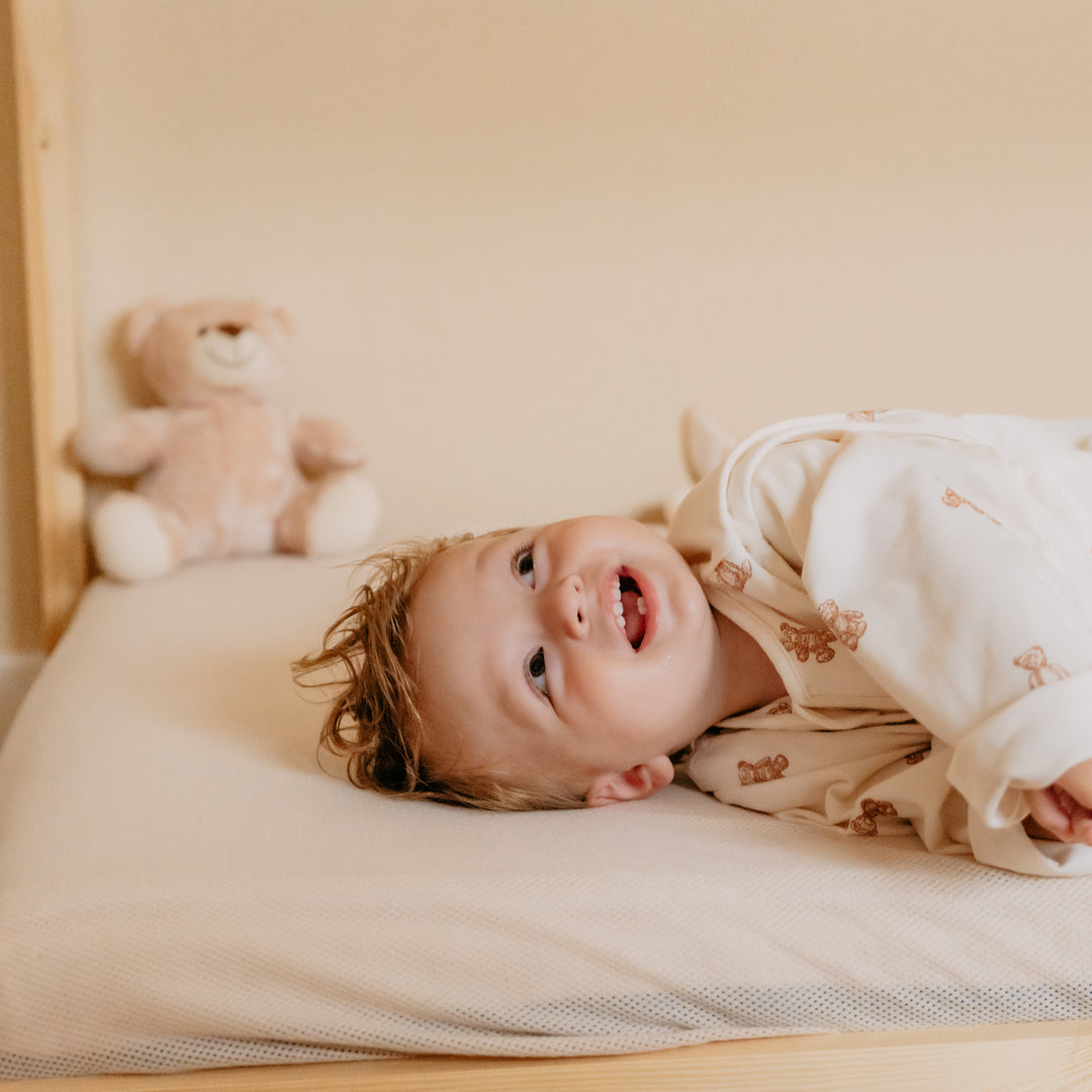 Hoe kies je de juiste maat voor je slaapzak? Om te weten welke maat jouw kindje nodig heeft, meet je je baby op van de schouders tot de voetjes. Tel daar nog zo’n 10 à 15 centimeter bij en je hebt de juiste maat! Belangrijk: koop je slaapzak nooit te groot. Als de hals of armopeningen te groot zijn, kan je baby wegzakken in de slaapzak. Kies een slaapzak met de juiste TOG waarde. TOG staat voor Thermal Overall Grade. Deze waarde geeft aan hoe warm een stof/textiel is en hoeveel lichaamswarmte de stof vasthoudt. Hoe hoger de TOG-waarde, hoe hoger de warmte- en isolatiegraad van de stof. Is het koud in de slaapruimte, kies dan een slaapzak met een hoger TOG-cijfer. De TOG waarde gaat van 0 tot 4 en geldt enkel bij kamertemperatuur, niet voor buiten. Ontdek er alles over in onze blog: https://www.degeleflamingo.com/blogs/news/alles-wat-je-wil-weten-over-tog