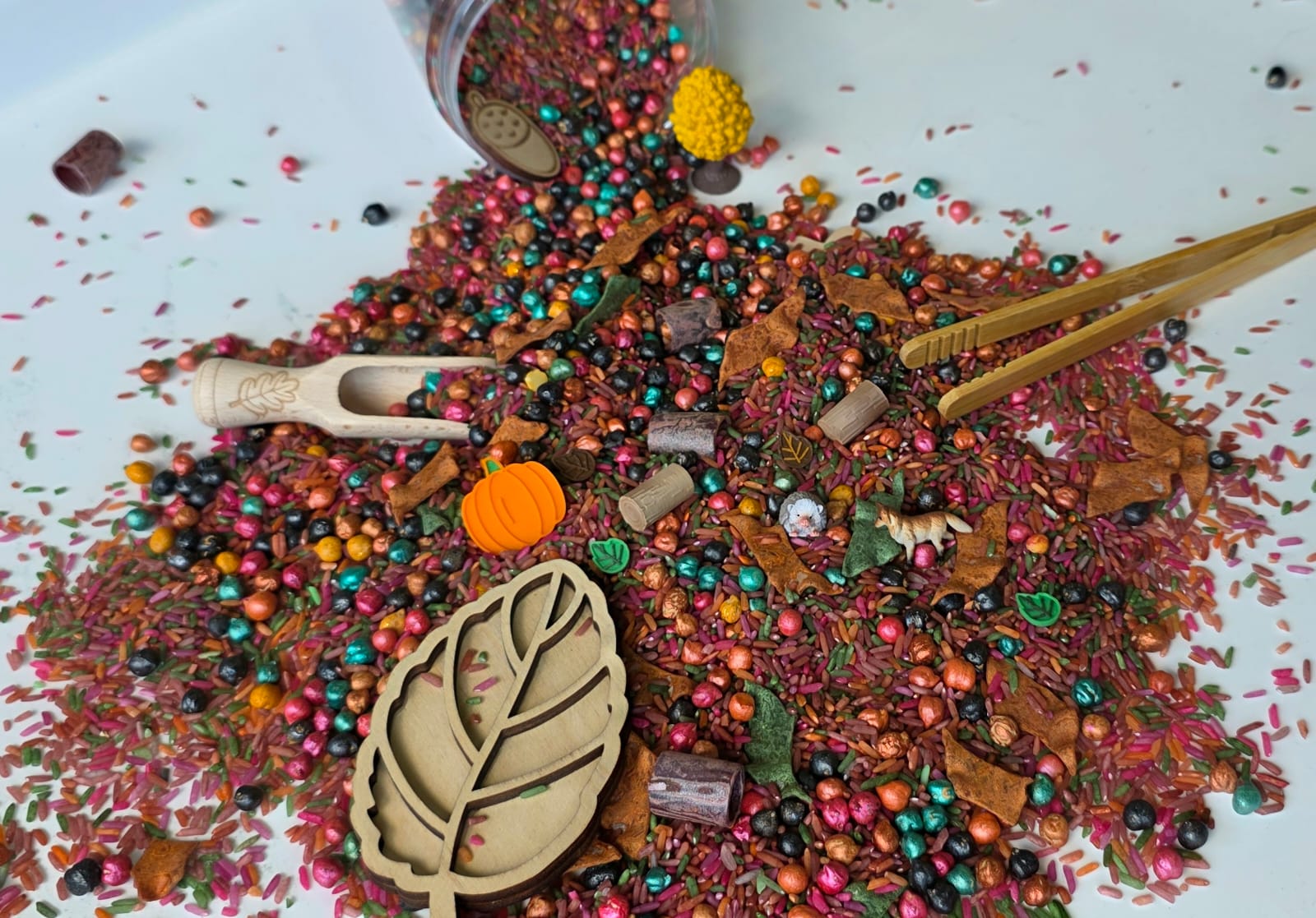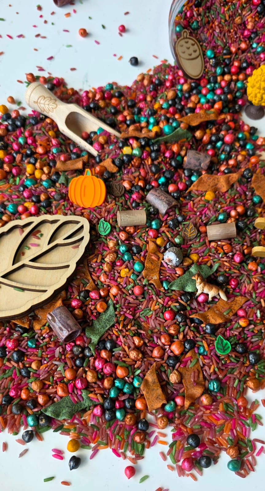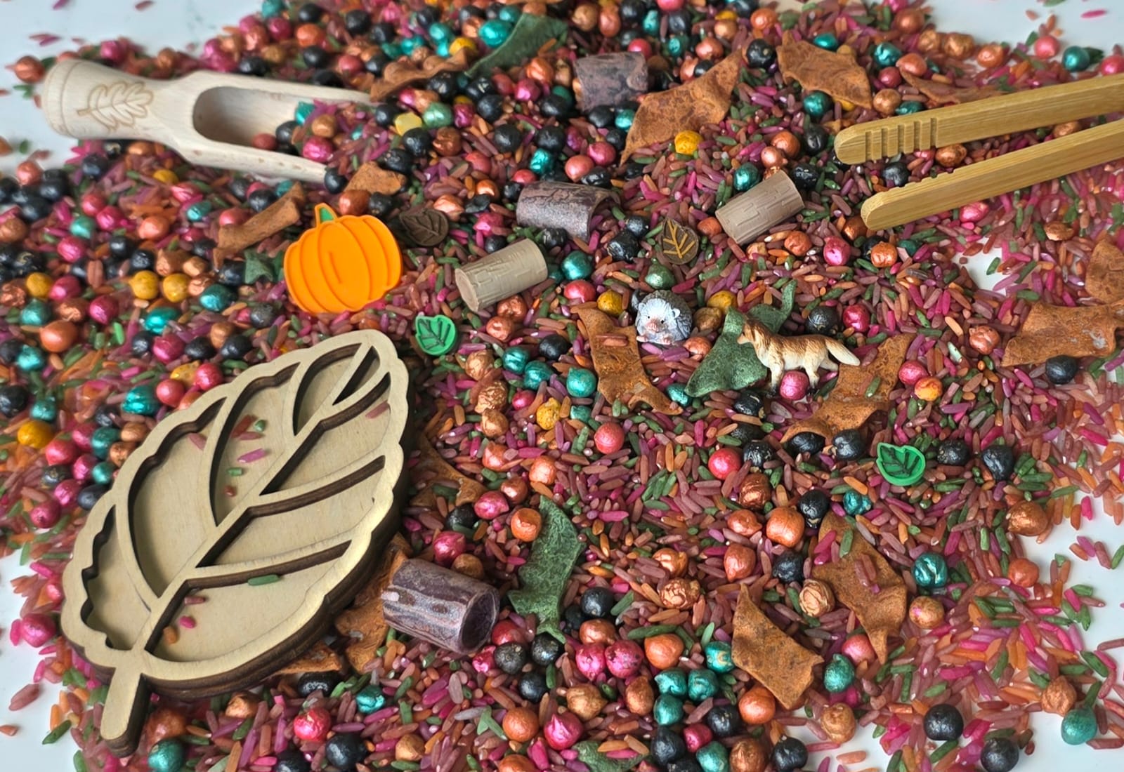 Mega pot van 1250 ml compleet gevuld met van alles om meteen te beginnen met spelen, ontdekken en beleven. Een grote 1,2 kg sensory play-mix in een herfsthema met gekleurde speelrijst, kikkererwten, houten figuurtjes en speelmateriaal zoals een schepje en pincet — ideaal om direct in een bak te gieten voor sensorisch, open-ended spel dat zintuigen en motoriek stimuleert.