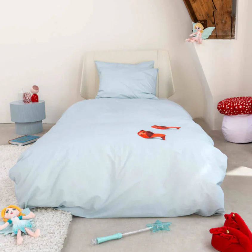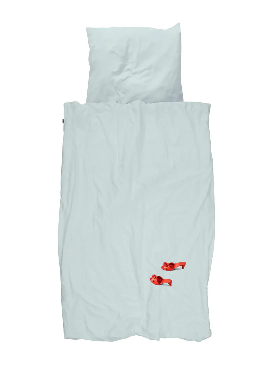 Ze dansen. Altijd maar door. Over lichtblauw biologisch katoen, tot aan de rand van je bed. De rode schoentjes maken van jouw bed de dansvloer van het Sprookjesbos.