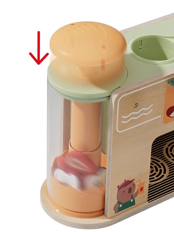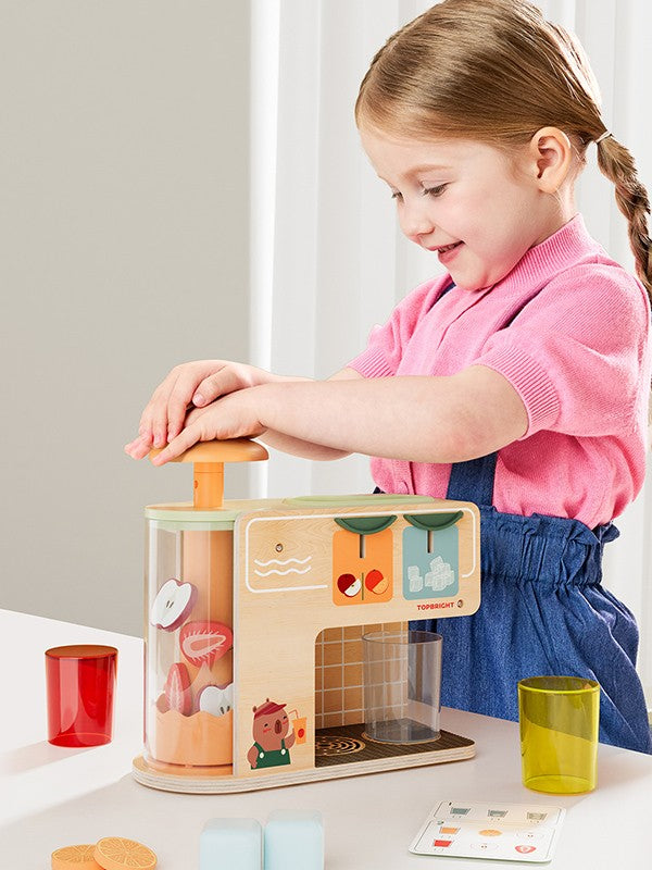 Stap binnen in je eigen sapbar met de Montessori Juice Boutique! Deze houten speelset laat kinderen vanaf 3 jaar op een leuke en leerzame manier in de huid kruipen van een echte sapjesmaker. Met een mechanische sapdispenser, kleurrijke fruitblokjes, ijsblokjes en een menukaart beleven kinderen eindeloos rollenspelplezier. Het draaien van de spiraal laat de stukjes fruit “echt” mixen, en de vallende blokjes zorgen voor vrolijke geluidseffecten. Volledig batterijvrij, veilig, duurzaam en Montessori-geïnspireerd.