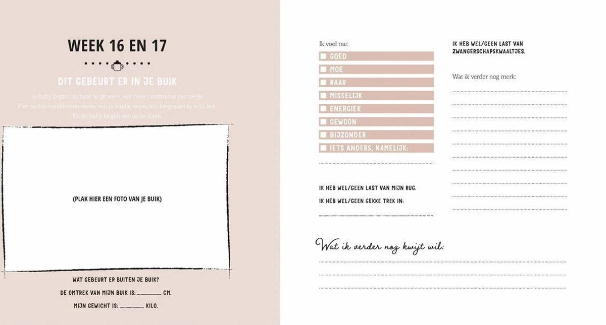 Een hip, eigentijds invulboek met stevig linnen kaft en gouden foliedruk! Schrijf alle dingen omtrent je zwangerschap die je wilt onthouden in dit negen maandenboek. Zo creëer je een geweldige herinnering voor later!
